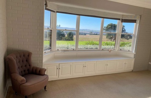 WERRINGTON is a beautiful country homestead set amongst olive and elm trees overlooking vineyards with 180 degree views. Large loungeroom with huge fireplace connected to circular conservatory with floor to ceiling windows out to the garden and pool. The kitchen incorporates a 12 seater dining table with another 6 seater table next door in the conservatory..The kitchen equipped with all modern appliances with unsurpassed views crossover to the large swimming pool ,viewing deck for evening cocktails whilst the sun goes down. Wi-Fi throughout, ample parking and a big fire pit.