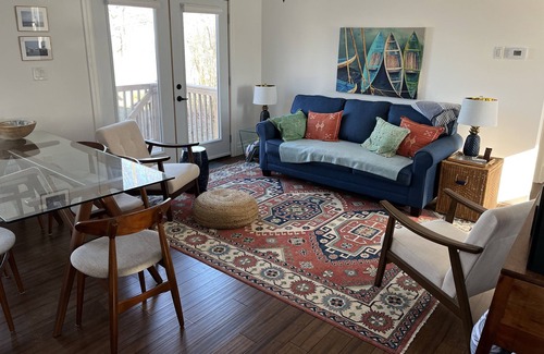 The Lake House is on a bluff so there is a 5 minute walk to the private beach.