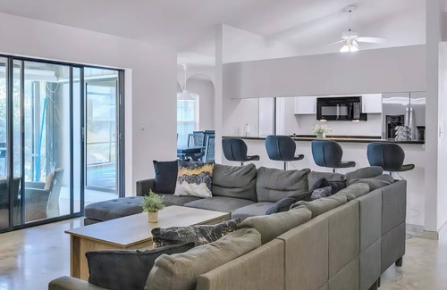 This modern and comfy getaway will leave you in awe: Luxurious crosscut Travertine marble floors and baseboards extend throughout the home, with an open concept Kitchen/Living Room design that is both inviting and relaxing. This beautiful waterfront home with enclosed pool overlooking the water is located in one of the most desirable, family friendly, safe & convenient deed restricted housing subdivisions in Sarasota County! You will have access to the entire home and have complete privacy during your stay, so relax, unwind, and make yourself at home!