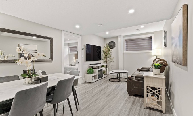 Experience luxury in our stylish basement suite with a private entrance. Enjoy upgraded appliances, a full kitchen, king bed, in-suite laundry, and superior soundproofing. Relax with a power recliner sofa, OLED TV (Netflix & Prime), and 1Gbps internet. Bright, spacious, and thoughtfully designed with a workstation and dining area. Just a 2-minute walk to transit— stampede is 20 minutes away for $3.80. Perfect for short or extended stays, close to all amenities. Your comfort awaits! (No animals allowed as my little kids are allergic)