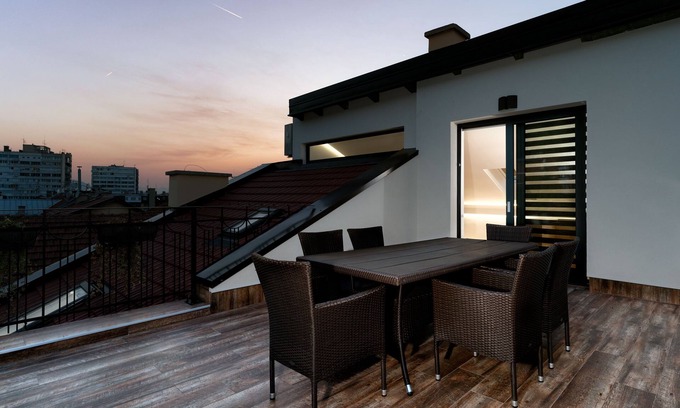 This one-of-a-kind spacious, clean and modern penthouse is located in a historic Austro-Hungarian building in the heart of Sarajevo. It’s a short 2-minute walk to the National Theater, and the vibrant cultural center of town. This is the ideal spot for exploring restaurants, museums, live music spots, and the cultural heart of Sarajevo’s historic Ottoman District. After exploring, you can relax and enjoy sunsets on the penthouse’s spacious terrace with beautiful views of the city.