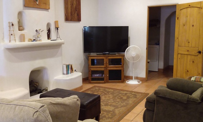 The Luxury Mountain View Suites is a large pueblo styled home featuring a downstairs master suite with a spacious fully equipped kitchen, dishwasher, garbage disposal, large living room with remote control Kiva styled fireplace, high definition receiver and flat screen TV, master bedroom with queen bed, and one and a half bathrooms, with a washer and dryer. Experience all the comforts of home, with expertly laid tile and hardwood floors throughout.
