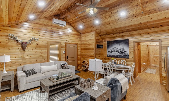 Stay at a luxury 2 bedroom fully remodeled cabin on a historical farm! This 45-acre property features stunning views of the farm. Our (non-working) farm is located approximately 30 minutes from Dallas, close to Rockwall and Lavon Lakes. Three fully stocked ponds with docks are fishing ready, and acres of land provides ample area for hiking and exploring. 5 total cabins are available on the property to rent. Inquire for more information.