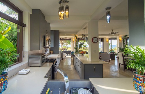 The villa offers a large open concept living and dining room with french doors that open out to the patio and garden with amazing view of the sea and sunsets.