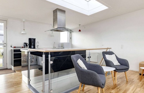 Layout: open kitchen(cooker(electric), hood, coffee machine, microwave, dishwasher, fridge-freezer, tumble dryer, washing machine), Living/bed room(single folding bed, TV(cable, german television channels, danish TV channels (DR1 and TV2)), DVD player, CD player, stereo unit), bedroom(double bed), bedroom(double folding bed), bathroom(floor heating)(bathtub or shower, washbasin, toilet), terrace, BBQ