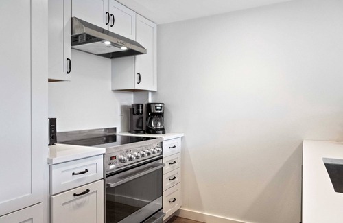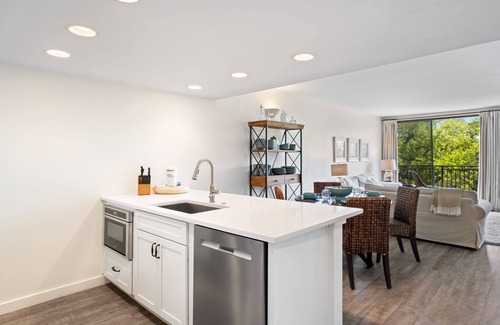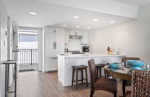 The dining area opens to a fully equipped kitchen with all new quartz countertops and cabinets. Dining table seats four and island has three counter stools.