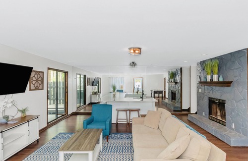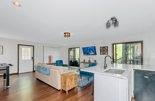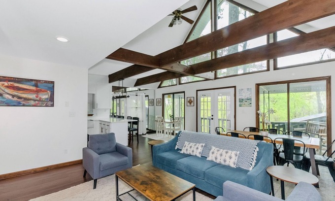 The space has 3 bedrooms and 3.5 baths and can sleep up to 8 people. The two twins in the common area are rollaway beds. The open concept living room has 25 foot ceilings with multiple views of the lake and a large dining table and eat in kitchen. There is a 55 inch TV in the basement with a foosball table, giant Jenga, and a classic Nintendo system. There is a covered outside dining table in the gazebo with a grill and a couch. The other decks have a fire pit and sun loungers. There is a boat ramp close by to drop in your own boat or you can rent a pontoon boat. Only 2 boats allowed on the dock for safety reasons. We also have 2 kayaks. There is parking for up to 8 cars in the lot next to the house. The Jasper County short term license number is STR 2024-01 .