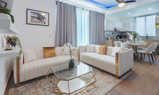 Step inside to soaring high ceilings, abundant natural light, and modern contemporary furnishings. The open-concept living area seamlessly connects to the fully equipped kitchen and dining space, making it perfect for entertaining or enjoying family meals. Each spacious bedroom is designed for relaxation, with plush bedding, room darkening curtains, ample storage, and private decks for outdoor lounging to enjoy the sunshine, and the tropical breeze.