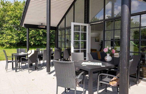 Layout: open kitchen(cooker(electric), hood, coffee machine, microwave, dishwasher, fridge, freezer(60-99L)), Living/bed room(TV(cable, german television channels, danish TV channels (DR1 and TV2)), radio, CD player, stereo unit, high chair), bedroom(double bed, children's bed), bedroom(double bed), bedroom(2x single bed), bedroom(2x single bed), bedroom(2x single bed), bedroom(2x single bed), bedroom(2x single bed), bathroom(floor heating)(tumble dryer, bathtub or shower, washbasin, toilet, washing machine), bathroom(floor heating)(bathtub or shower, washbasin, toilet), bathroom(floor heating)(bathtub or shower, washbasin, toilet), mezzanine(4x single folding bed), game computer, Bubble bath(indoor, heated, 4 persons), Bubble bath(outside, 4 persons), sauna(indoor, 4 persons), sauna(outside), heating(electric), terrace, terrace(roofed), BBQ, swimming pool(indoor, 180 m2), table tennis table, table football, darts, billiards, air to water heatpump