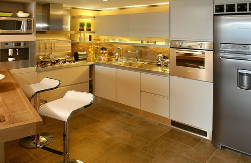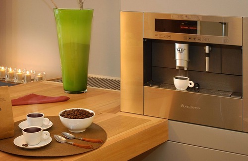 -gourmet kitchen with stainless steel surfaces, breakfast bar and built-in Ariston coffee maker with complimentary coffee beans.