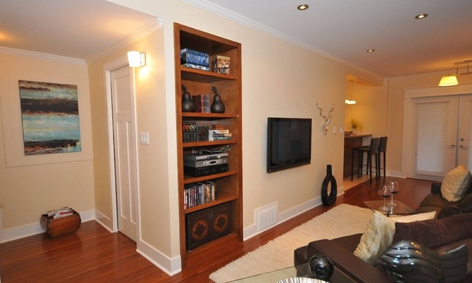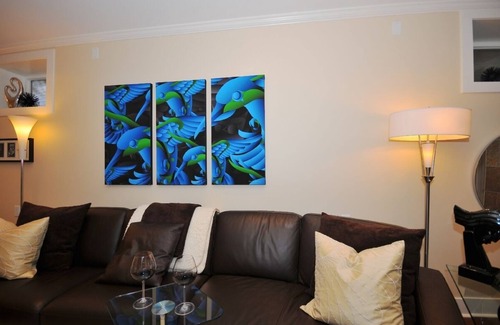 Luxury off Main is all the name implies: A spacious, modern, fabulously appointed one bedroom luxury apartment; located on a sleepy tree lined cul-de-sac just one block from the restaurants, pubs and boutiques of hip Main Street. 700 square foot apartment has been professionally designed and decorated to meet the highest expectation's of comfort and taste. Italian furniture, hardwood floors, original art work, heated bathroom tile floors, Large bedroom with queen size bed adorned with Egyptian cotton sheets and silk or down duvet and a comfortable fireside chair to curl up in. Fully equipped kitchen, designer bathroom with glass shower and granite topped vanity; with spa robes for lounging in. Front loading LG washer and dryer. Outside is a covered patio opening to a fully landscaped yard to relax in.
