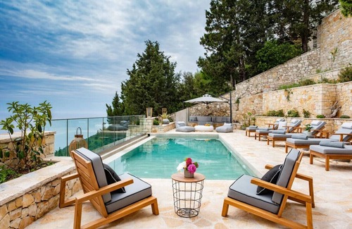 Premium amenities include designer lighting, natural stone finishes, and a fully equipped kitchen. The outdoor spaces showcase covered dining areas, premium teak furnishings, and an infinity pool overlooking the sparkling Ionian Sea.