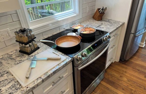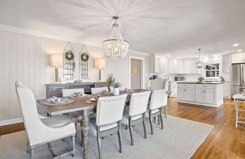 Let all your worries drift away as you relax at this 3-bed, 3-bath luxury Lake Wylie vacation home. This home sits in the midst of a 1000+ acre McDowell Nature Preserve, where you will see plenty of deer, turkeys and other wildlife playing in the woods. You will truly feel like you have escaped civilization. on a more than one acre point, a beach and dock on Lake Wylie with incredible main channel views and sunsets.. This 1965 home was completely renovated at the beginning of 2020, we then renovated the bathrooms at the beginning of 2022 to add walk in tiled showers and glass enclosures. We bought it with a vision for a family getaway for our four generations of family, after the extensive renovations it is now a luxury lake retreat for those who stay there. With gorgeous views from almost every room, you'll be living in luxury during your stay at this spacious lakefront home. Top floor has two bedrooms (a large master suite and a second bedroom) with two baths and a number of living areas. The lower level has a separate entrance to a spacious second master suite with one bedroom, one bath, kitchen, living and eating area. Spend your days kayaking, paddle boarding, hiking, boating around Lake Wylie that boarders North and South Carolina, or fishing up some dinner! After a day of adventure come back to unwind on one of the patios as you cozy up to the fire pit and watch the sunset with a favorite beverage in hand.