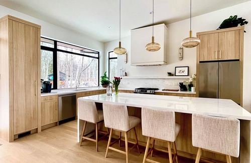 SEASONAL AVAILABILITY ONLY! The ultimate winter ski chalet getaway across directly across the street from Georgian Bay with lake access. 5 minutes to downtown Thornbury and 15 to the ski hills. This brand-new luxury chalet offers upscale style, tranquility and convenience. This 3 Bedroom, 3 Bathroom home is perched in the forest with a hot tub waiting for you. A running brook that runs through the property has a bridge that crosses over to miles of snowshoeing in the forest behind. A rec room on ground level for kids and elegant open-concept upper level with fireplace for lounging adults. Heated breezeway for easy in/out access. This ski chalet is for the discriminating who want all the comforts and style of home and so much more.