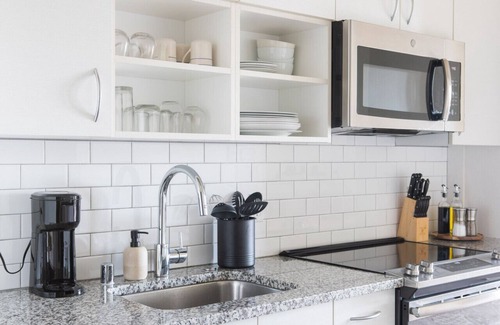 24-hour fitness center, community kitchen and lounge, community outdoor deck with grills, smart TV, self check-in, high-speed Wifi, laptop-friendly workspace/dining table (when Murphy bed is not in use), additional desk nook next to Murphy bed, private balcony, and in-unit laundry