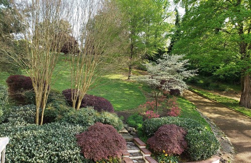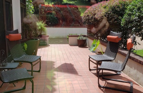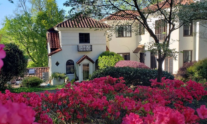 Gorgeous private suite in Mediterranean Villa with high ceilings, French doors to tile patio, floor to ceiling bookshelves, and hardwood floors. Huge spa shower with glass lined walls and stone floors. View of formal garden. Plush queen size bed, Matching Four Seasons robes provided with hotel quality linens.
