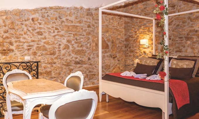 The Deluxe Suite is a refined two-level retreat, designed to offer an intimate and luxurious stay for up to four guests. The upper floor features a romantic canopy bed, ideal for moments of relaxation and intimacy. The lower level includes an elegant living area with a fully equipped kitchen and a cozy dining space, all thoughtfully styled.