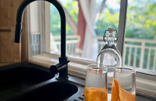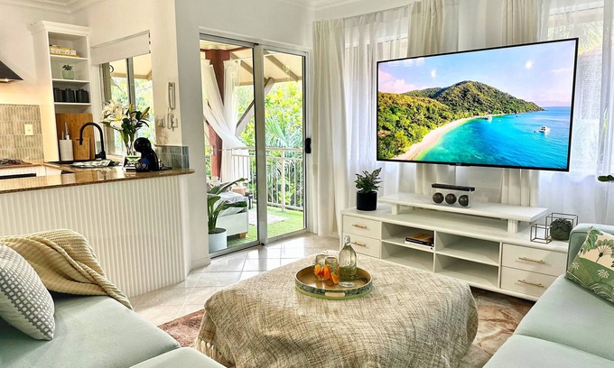 The apartment features open-plan living with a tropical twist. We have a 60” wall mounted TV and a large comfortable sofa to watch it on. The two well appointed bedrooms both have smart TV’s with Netflix, KING beds and relaxing treetop views.