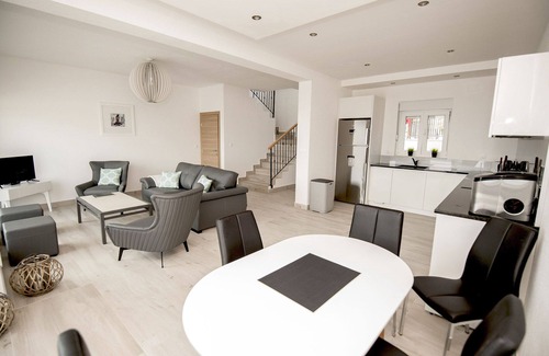 The interior of the property is fully air-conditioned throughout and an open plan living area with comfy sofas, Wi-FI and TV enables you all to enjoy modern family time together. The picture box window here overlooks the pool, mountains and across the valley to the ever changing colours of the Adriatic Sea. An additional WC is located just off the lounge area.