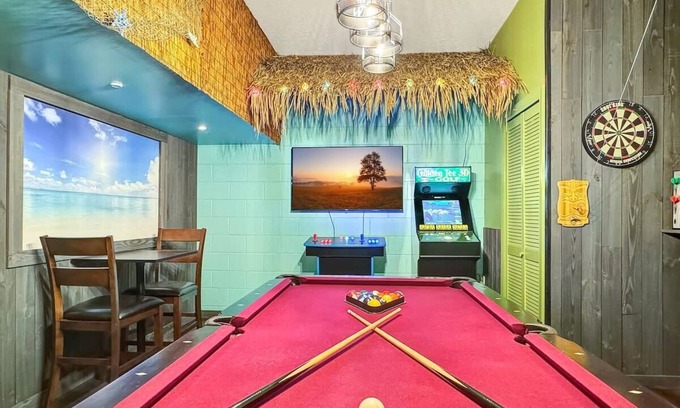 - Tiki Bar themed game room that is great for kids and adults. It’s fully climate-controlled and is set up for hours of entertainment. The game room features a pool table, darts, and tiki ring toss. For video game lovers there is a classic arcade console of 5,000 games that are displayed on the 65” HDTV. Games include Super Mario Brothers, Galaga, Mario Cart, Tetris, Mortal Combat, and more. Additionally, there is a full-size Golden Tee arcade game that plays several classic golf games and bowling.
