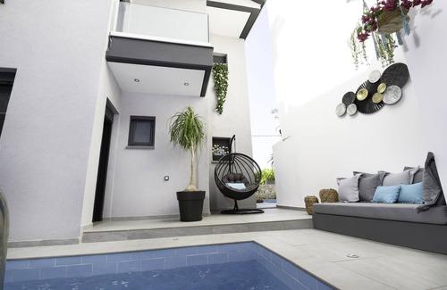 It is 65 square meters and can accommodate 4 people. It has one bedroom with king size bed and bathroom upstairs, one bedroom with queen size bed and bathroom downstairs, kitchen, living room, yard and shared 10 sqm swimming pool. You will love it!