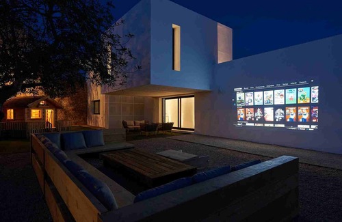 At the back of the house there is a little wooden playhouse with a sand pit, a wonderful space for children to play. Adjacent to the play area there is an outdoor cinema with a large seating area - connected to the smart TV, the cinema screen is projected onto the wall, great for family gatherings in the evenings.