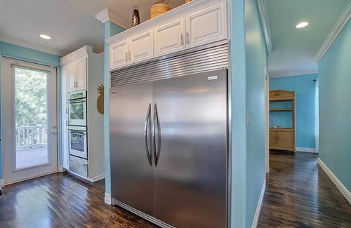 Our house comfortably sleeps ten people- or 3 couples and 4 children! The bedrooms are located on the first and third floors, while the second floor has a kitchen, wet bar, game room/office, dining areas and entertainment. This allows plenty of space for your group! The downstairs bedroom is handicap accessible and there's an elevator in the house to easily get to the kitchen and balconies.