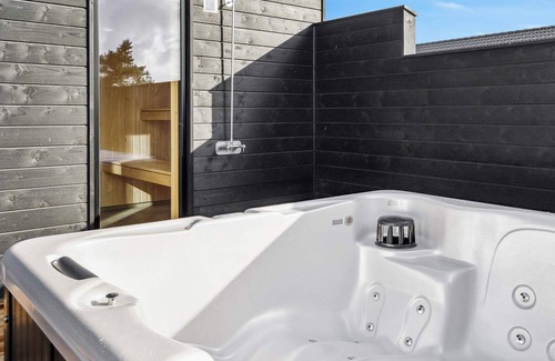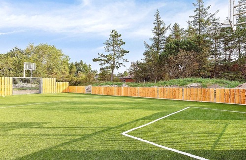 Layout: Kitchen(coffee machine, microwave, dishwasher, fridge-freezer), Living/bed room(TV(german television channels, danish TV channels (DR1 and TV2), norvegian TV channels , swedish TV channels), children's bed, high chair), bedroom(2x single bed), bedroom(2x single bed), bedroom(2x single bed), bedroom(2x single bed), bedroom(2x single bed), bedroom(2x single bed), bathroom(washbasin, shower, toilet), bathroom(washbasin, shower, toilet), bathroom(washbasin, shower, toilet), mezzanine(4x single folding bed), tumble dryer, Bubble bath(outside, heated, 6 persons), shower(outside), sauna(outside, 6 persons), washing machine, heating(electric), garden furniture, sun loungers, swimming pool(indoor), play equipment, table tennis table, table football, darts, billiards, air to water heatpump