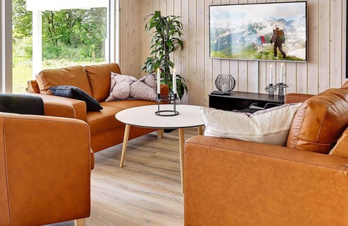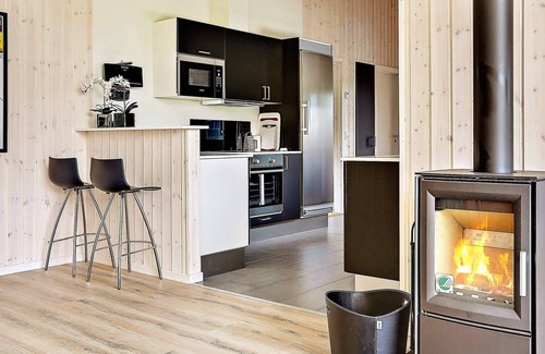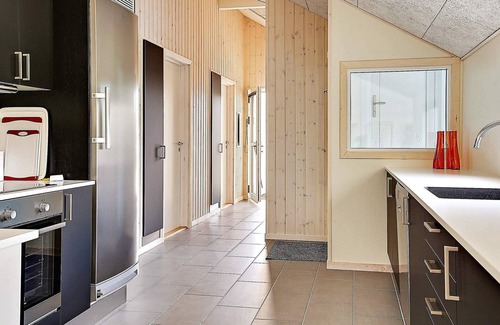 Layout: open kitchen(cooker(electric), hood, coffee machine, microwave, dishwasher, fridge-freezer, tumble dryer, washing machine), Living/bed room(TV(german television channels, danish TV channels (DR1 and TV2)), DVD player, CD player, stereo unit, high chair), bedroom(double bed, children's bed), bedroom(double bed), bedroom(2x single bed), bedroom(2x single bed), bedroom(2x single bed), bathroom(floor heating)(bathtub or shower, washbasin, toilet), bathroom(floor heating)(bathtub or shower, washbasin, toilet), mezzanine(4x single folding bed), Bubble bath(indoor, heated, 6 persons), sauna(indoor, heated, 4 persons), terrace, terrace(roofed), BBQ, swimming pool(indoor), play equipment, table tennis table, table football, darts, billiards, geothermal energy, geothermal energy, solar energy