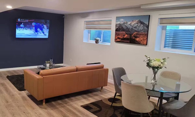 This private basement suite (no shared space) is ideal for a single person, couples, or a small family. The recreation room comes with a 60" smart TV with WIFI capability for your favourite streaming services.