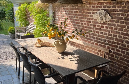 This uniquely situated estate is nestled in the rolling hills of the unspoilt landscape of the Herve country, a stone's throw from Maastricht, Liège and Aachen. Optimal privacy in the middle of nature and yet also only 20 minutes by car from the Vrijthof in Maastricht, the center of Aachen and the beautiful city of Liège. The area is characterized by low hills with meadows hemmed with hedges and orchards. The house and the garden are very child friendly. The house is reached via a private road of 500 meters so there is no traffic and children can run around freely. Play equipment, sandpit, table football and table tennis table.