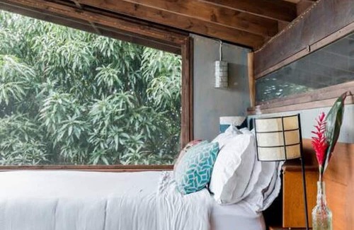Wake up eye-level with the canopy in a lofted bedroom with floor-to-ceiling windows and traditional furnishings. Nestled among forest and rich with daylight, this tropical hideaway offers an unmatched open-air environment with eclectic adornment.
