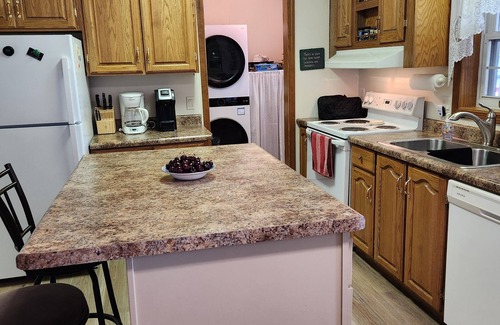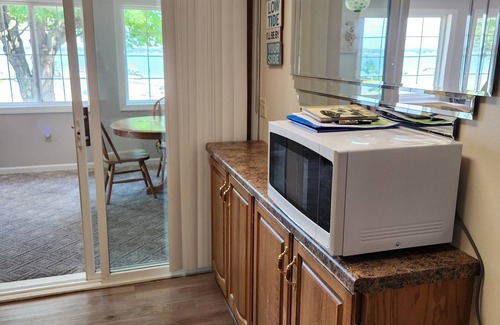 Our home includes 3 BRs, 2 full Baths, a totally remodeled (2013) kitchen, LR with cable TV and DVD player, a family room with a dining area that looks out over the beach and lake, fold out futon for additional sleeping space and another cable TV with DVD player. A one-car garage includes a 2nd refrigerator and gas grill. The yard (lakeside) includes a patio, picnic tables and a glider under a huge old maple.