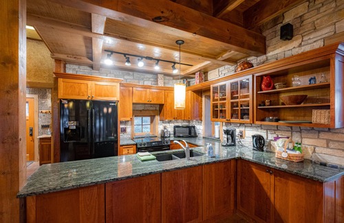 The cozy stone/wood/bark cabin has an open first floor plan with 200+ degree lake views, leather window seats, a wood-burning fireplace, modern kitchen with all the conveniences, a living area for dining and lounging, and a half-bath. On the lake side, there’s an expansive enclosed porch that’s perfect for enjoying your evening cocktail. The second floor has two sun-filled bedrooms with queen beds and two luxurious bathrooms. And then there's the unique artistic details that make this an inspiring, one-of-a-kind property; including 88 handmade lamps/illuminated panels. A comment from a guest who works with architects: “If you’re contemplating building a home or cabin, spend a week at this amazing place. It’ll be the best investment you’ll ever make.”