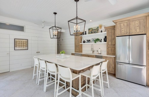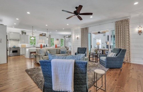 The centerpiece of the home is the gourmet chef's kitchen, and no detail has been forgotten. The kitchen is fully equipped with every appliance and utensil you will need during your stay. Featuring an oversized built-in refrigerator/freezer, gas range, two dishwashers, and an iconic large island space with space for four to eat or snack. The dining space has an expansive dining table with room to comfortably seat 10 people. Adjacent to the kitchen is a living space and wet bar for all of your entertaining needs. Enjoy all of the comforts of home while you relax on the oversized custom furniture and watch the large flat screen tv.
