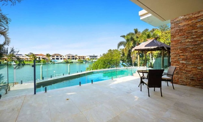 Prepare to be dazzled by the scale, style and quality of this magnificent multi-level mansion overlooking Main River on the prestigious Isle of Sorrento. Occupying a private 1,086m2 parcel at the end of a cul de sac, a secure gatehouse reveals a vast tiled forecourt that sets the stage for a timeless architectural design. A grand sense of scale is established on entry where 4.8m ceilings and extensive glazing shed natural light across living, dining and entertaining of generous proportions. A slender indoor pool finished in azure blue glass mosaic tiles is the central focal point of ground floor living, with a classy cocktail bar, formal dining and relaxed sitting on one side, and an entertainer's kitchen plus butlers pantry and casual dining on the other. A marble staircase leads to four generous bedrooms, including a grand master suite and a second bedroom with river to city skyline views. Guests can get comfortable in a supersized ground floor suite with private access, walk-in robe and ensuite. An observatory terrace captures spectacular view lines across the water to the city skyline where iconic buildings such as Q1 in Surfers Paradise turn to sparkling lights by night. Resort-style leisure plays out across a riverfront terrace with thatch Bali pavilions, tropical gardens, swimming pool with underwater stools, and a sauna inside. A pontoon caters for luxury cruisers while prestige vehicles are safely stored inside two garages.