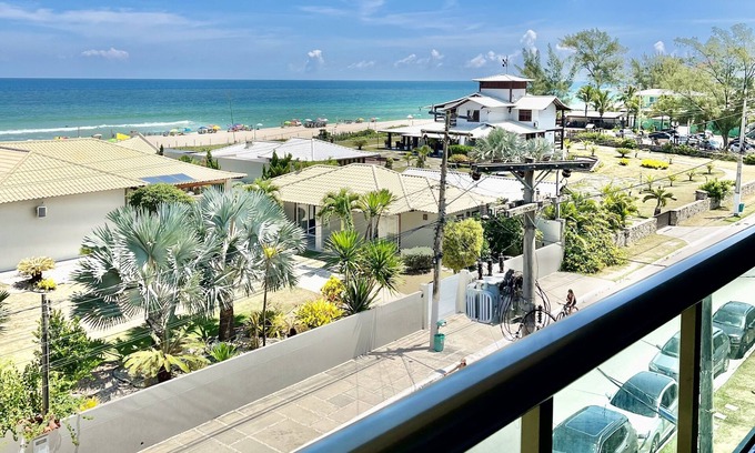 Very cozy apartment with sea view and Saquarema Church, furnished with every comfort: BALCONY (sea view bench), LIVING ROOM (nice dining table, TV, radio, cozy sofa, rack), 2 BEDROOMS 1 with bathroom and air conditioning (box beds, curtains), 2 BATHROOMS (luxury shower, mirrors), KITCHEN (fridge, stove, tank, granite countertop, planned kitchen cabinet), fan, screen for children, elevator, Vacancy for 1 vehicle with marking.