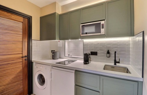 The suite is fully air-conditioned and thoughtfully designed, featuring a comfortable sleeping area separated by a decorative screen, a cozy dining corner, and a modern kitchen equipped with everything you need—including a coffee machine, cooktop, and washing machine. High-speed Wi-Fi and a smart TV ensure both convenience and entertainment throughout your stay.