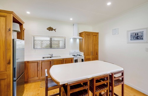 Step inside to find a bright and breezy living space that captures the laid-back charm of beachside living. The open-plan lounge and dining area is comfortably furnished and filled with natural light, creating a cosy hub for relaxing after a day in the sun. A well-equipped kitchen provides everything you need to prepare meals, while glass doors open out to a sunny outdoor area ideal for enjoying your morning coffee or an evening BBQ as the sun sets.