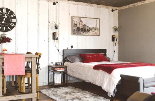 Enjoy a stylish stay at this centrally located, solar powered airbnb. All the amenities of home in a rustic setting. Real barn wood wall and tin ceiling. Electric fireplace, 65" smart tv, washer/dryer, dishwasher, stove, refrigerator,AC and more. Sleep on the comfortable Nectar queen mattress. Couch is a sleeper sofa with full size bed for extra sleeping space. Bars, restaurant, grocery store and gas stations nearby.