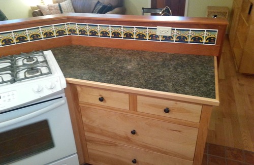 The cottage was built only a few years ago. It is a true studio with only the bathroom separated from the living space. There is plenty of living space with a full size leather couch and a reclining chair. A separate TV area has a loveseat. The dining area is setup for four people. The sleeping area has a new queen size bed and is separated by a desk and bookshelf arrangement. The full bathroom includes a washer and dryer. The kitchen is fully equipped with a gas stove, lots of handmade cabinetry, and a back splash of mahogany and Mexican tile. The ceilings are cathedral and covered with Maine cedar.
