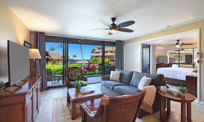 This single level floor plan opens up to a lanai with a beautiful ocean view, steps away from the pool, hot tub, and shared grill area. There are some stairs leading down to the unit. The primary bedroom has a king size bed memory foam mattress and TV, the guest bedroom has a queen size bed, and the second guest bedroom has 2 twin beds (these cannot be combined). A full size sofa sleeper in the living room offers an additional sleeping place (a $50/night additional guest fee is applied for 7th & 8th guest).