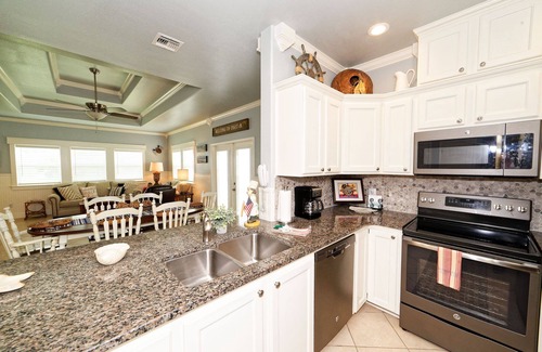 Kitchen: This open floor plan kitchen boasts all the creature comforts of home. You will be able to prepare many of your family meals here. This kitchen is fully stocked for your enjoyment. There is a breakfast bar and a table to seat 6.