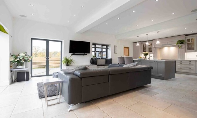 A spacious modern home with hot-tub & fire pit situated in the countryside down a rural cobbled lane just 1 minute from the M60.