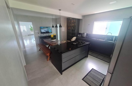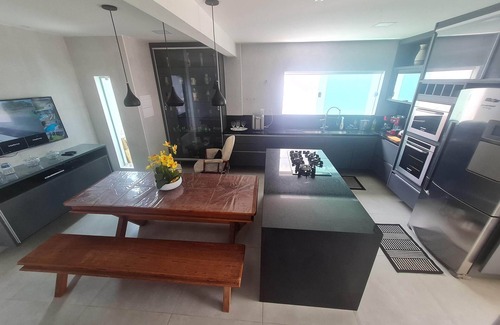 Fully furnished, nascent, duplex, 5 bedrooms (all with air conditioning) being 03 suites with balcony, 02 large rooms, 3 toilets, kitchen and equipped kitchen, garage for 07 cars, excellent outdoor area with pool, barbecue and sauna, land of 600 m² and 350 m² of built area. All this 200 meters from the beach.