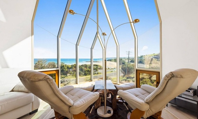 Spanning two levels, this home boasts a cutting-edge open plan design. The first floor's living area captures a dynamic 180-degree view of the sea, rolling hills, and the scenic Great Ocean Road leading to Apollo Bay. The open plan space features an angled glass atrium, bathing in sunlight as you gaze out at the waves and beach. Inside, you'll find a cozy lounge with a wood fire, leather couches, and a large TV, alongside a fully equipped kitchen and dining area.