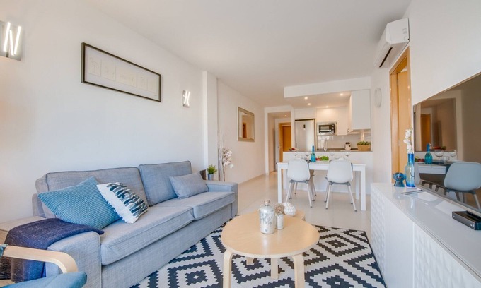Located just 350 meters from Alcudia Beach, Mar Blau is a bright and cozy 84m² apartment ideal for up to 5 guests. With a private balcony overlooking Puerto Alcudia’s charming streets, it's perfect for sunny breakfasts. The renovated living room includes satellite TV and a dining area, while the elegant open-plan kitchen features a breakfast bar for relaxed dining at home. The apartment offers three comfortable bedrooms—two with double beds and one with a single bed. Air conditioning is available in the living room and two bedrooms, while the third has a fan. Two bathrooms—one with a shower and one with a bathtub—ensure convenience. Wi-Fi is available throughout, and private parking in the building adds extra ease. Ideally located in a quiet yet central area, Mar Blau is just steps from supermarkets, restaurants, and bars. Alcudia Beach’s soft sand and clear waters are only a 2-minute walk away. The historic Old Town of Alcudia, with its vibrant market, is just 2 km from your door. This is the perfect beachside getaway in Mallorca.