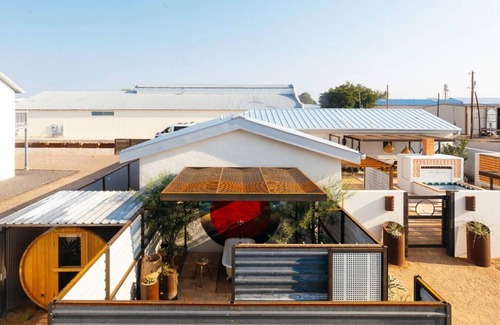 The shared courtyard is decked out with a beautiful fountain, dedicated dining area for dining al fresco, and a large outdoor fireplace to unwind under the stars. A custom BBQ grill adds to the charm for guests looking to grill and gather. The private spa-like outdoor tub area `Oasis` is reservable via QR code and features a vintage clawfoot tub. The shared sauna and cold plunge offer a one-of-a-kind relaxation experience in Marfa.