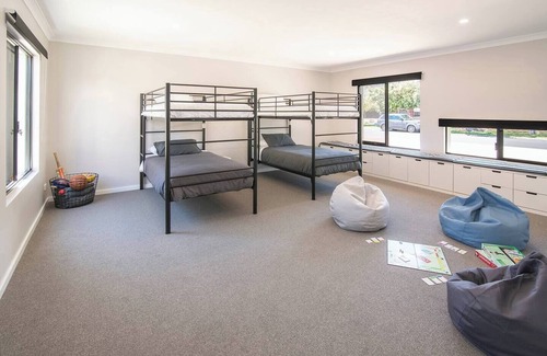 Unwind across five bedrooms, each offering quiet comfort. In the primary bedroom, stretch out on the king bed, catch up on work at the study nook and keep things tidy with a walk-in wardrobe before indulging in the ensuite. Drift off in two other king bedrooms, each styled with calming coastal décor. Ideal for kids or friends, the fourth bedroom features a king-single bunk, while the fifth includes two bunks, bean bags, and a window seat for reading. Refresh in the family bathroom with a bathtub or the third bathroom with a walk-in shower—making mornings smooth for larger groups. A full laundry with a washer and dryer helps keep things fresh throughout your stay.