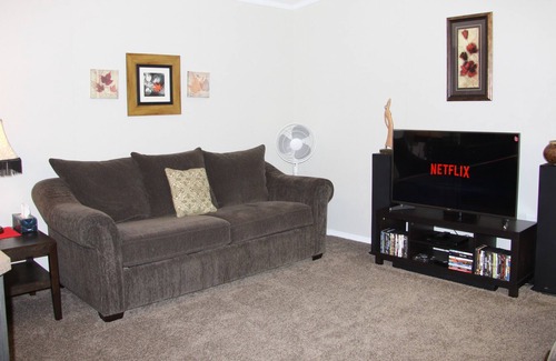 The living space is bright and open; a fully equipped kitchen, living room with Smart TV, movie library and stereo system. Step out on to the huge patio deck with dining table for 6 and additional lounging chairs and BBQ. The deck is as big as the interior of the house so you can fully enjoy the outdoors while on vacation!